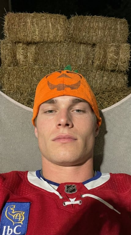 A JSON structure analyzing the likely prompt used to generate a high-quality smartphone selfie. The image features a young man wearing an orange jack-o'-lantern beanie and a red Montreal Canadiens hockey jersey, set outdoors at night in front of hay bales with harsh direct flash lighting.
