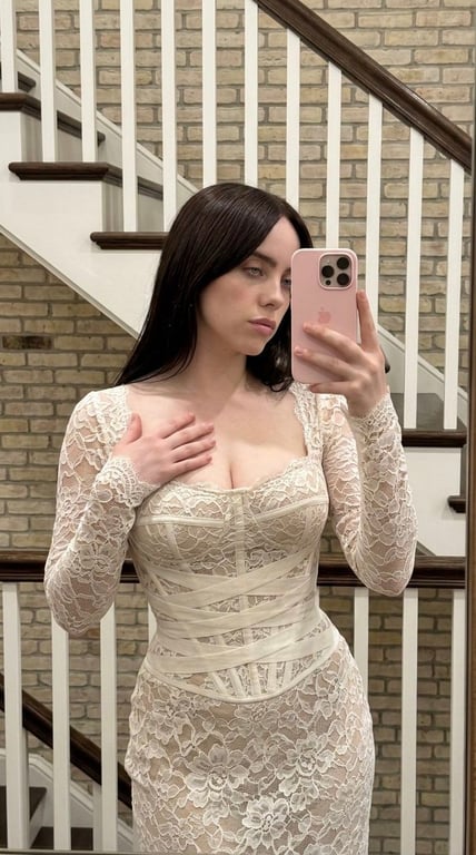 An extremely detailed prompt for generating a hyper-realistic mirror selfie with an identity lock on Billie Eilish, focusing on architectural bone structure refinement, high-gloss hair, detailed textile physics of a lace gown, and specific anatomical volume exaggeration.