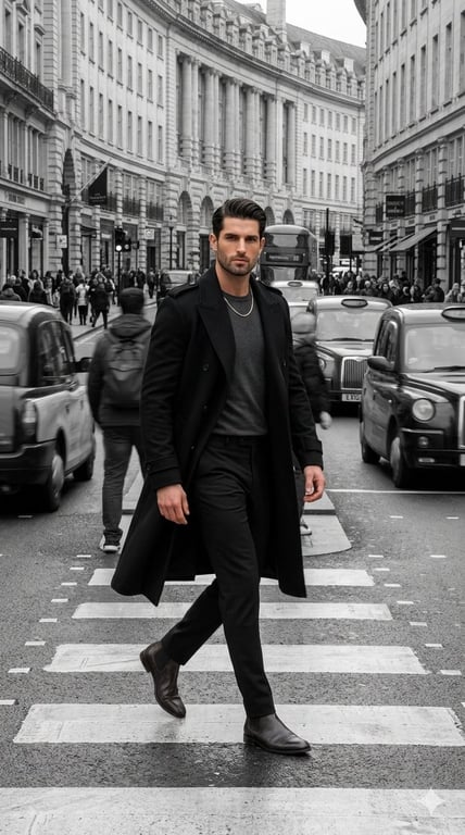 A prompt for Gemini Nano Banana Pro to generate a hyper-realistic cinematic street portrait of a stylish young man in a black trench coat. The image uses a monochrome background with the subject in color, emphasizing shallow depth of field and editorial photography style.