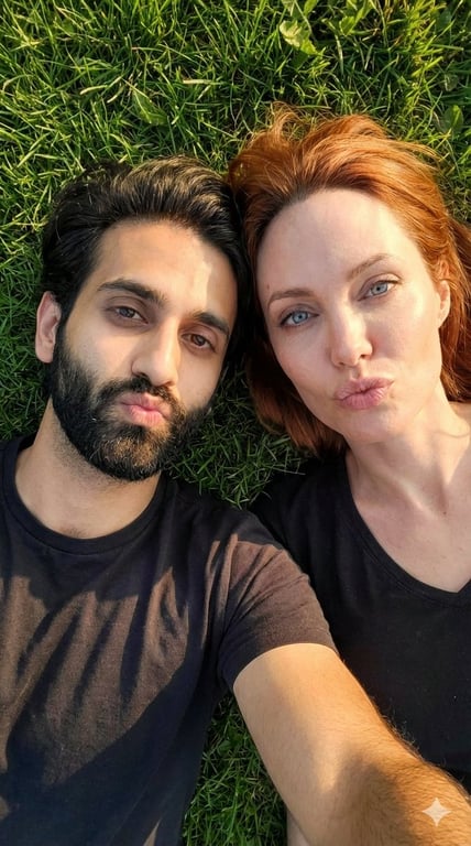A prompt for generating a hyper-realistic, candid, top-down selfie of a couple (with faces locked to an uploaded reference) lying on green grass, featuring golden hour lighting and playful pouting expressions.