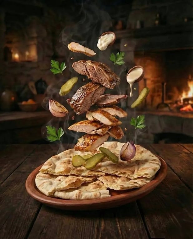 A detailed JSON prompt for generating hyper-realistic cinematic food photography of deconstructed Middle Eastern dishes (Shawarma and Mansaf), using levitating elements, dramatic lighting, and rustic kitchen settings.