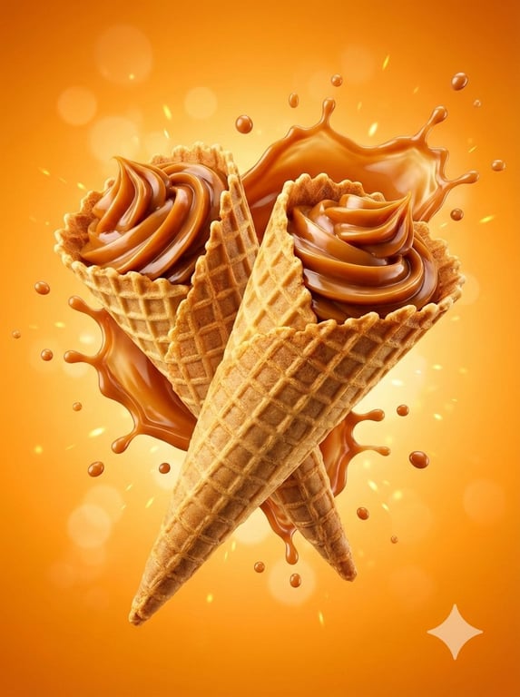 A highly structured JSON prompt for generating hyper-realistic commercial product photography of three different desserts (waffle cones, wafer rolls, ice cream), emphasizing frozen motion, dramatic lighting, and indulgent aesthetics.