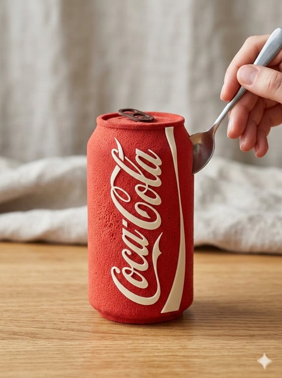 A dual prompt set for transforming an uploaded product image into a hyper-realistic edible dessert. The first prompt (Nano Banana 2) focuses on generating a static image with a soft matte mousse texture and natural daylight. The second prompt (Veo 3.1) focuses on generating a slow-motion video where a spoon gently cuts the edible product, revealing layered cake inside.