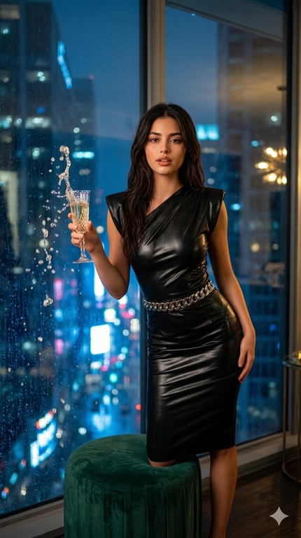A highly specific prompt for a hyper-realistic editorial shot of the user (requiring 100% exact facial features from a reference image) in a high-rise penthouse. It details the subject's outfit (black latex midi dress), the action (champagne overflowing from a crystal flute), the background (rain-slicked city at night), and complex lighting and camera settings to freeze motion.