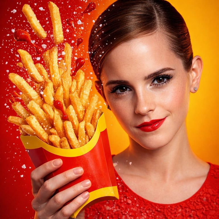A prompt for generating a hyper-realistic advertising visual of crispy golden fries spilling upward from a carton held by a young woman. It emphasizes frozen motion (salt crystals, ketchup droplets), ultra-sharp focus on texture, and a high-impact, punchy lighting style suitable for snack commercials.