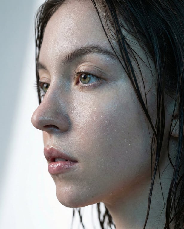 A highly technical JSON prompt focused on generating an extreme profile view of Sydney Sweeney with hyper-realistic skin textures and a 'wet' look. It specifies macro photography details (85mm macro lens, pore-level resolution), cool color tones, soft-box lighting, and detailed moisture effects (sweat, micro-droplets) to achieve a CGI photorealistic result without airbrushing.