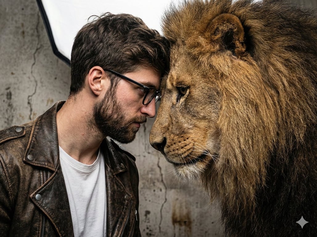 A prompt for generating a gritty, hyper-realistic portrait of a man and a lion, captured forehead-to-forehead, symbolizing a deep bond. It requires preserving the man's facial features from a reference image and emphasizes extreme detail (pores, individual hairs) using professional camera specs (Canon EOS R5, 85mm f/1.2) and HDR aesthetic against a simple concrete background.