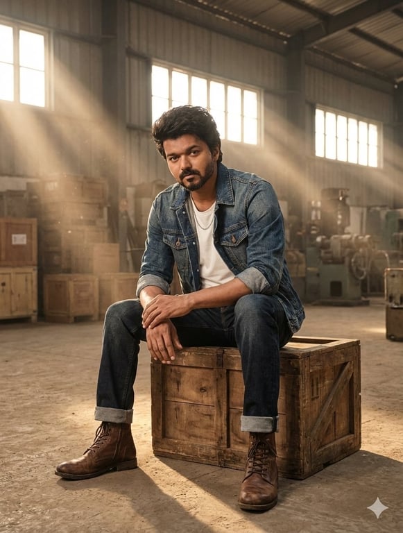 A concise prompt for generating a hyper-realistic 8K medium shot portrait set in a dusty warehouse. The scene is defined by late-afternoon sun beams cutting through suspended dust, highlighting the subject sitting on a vintage wooden crate, wearing raw denim and leather boots, emphasizing tactile realism.