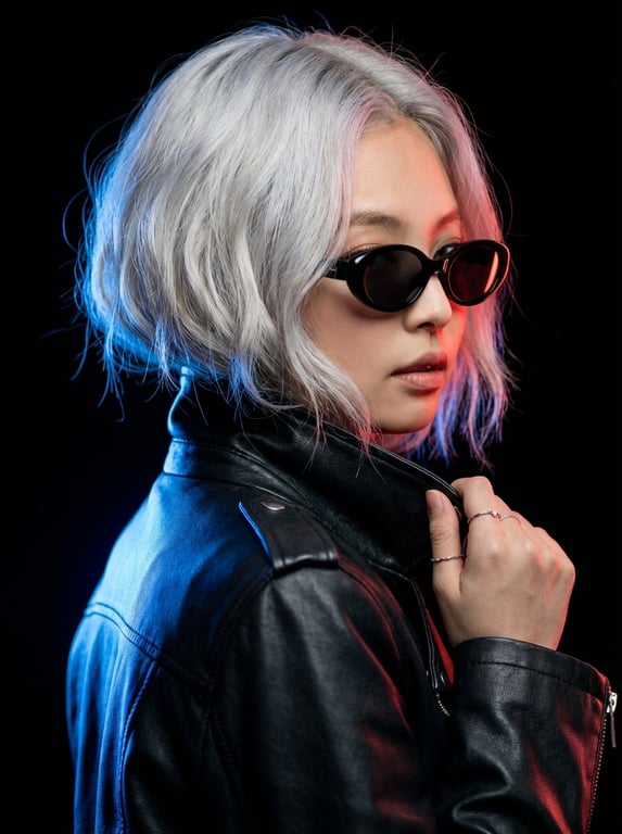 A detailed prompt for generating a hyper-realistic, cinematic medium close-up portrait of Blackpink's Jennie, featuring dramatic dual-tone studio lighting (blue rim light and warm red edge light) against a pitch-black background, emphasizing high contrast and commercial fashion photography aesthetics.