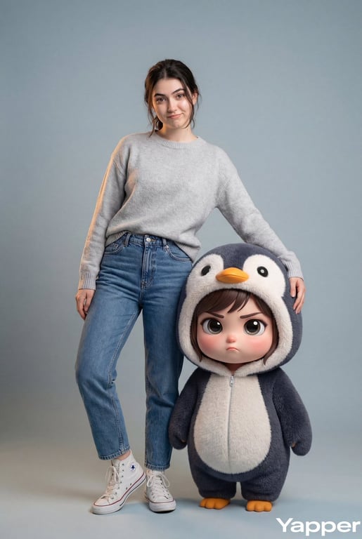 A structured prompt for Gemini Nano Banana Pro to create a hyper-realistic image of a stylish person (face preserved from a reference) interacting playfully with a 3D ultra-cute chibi character named Gugu Gaga, who is wearing a fluffy penguin onesie, set against a cozy, soft grey-blue backdrop.