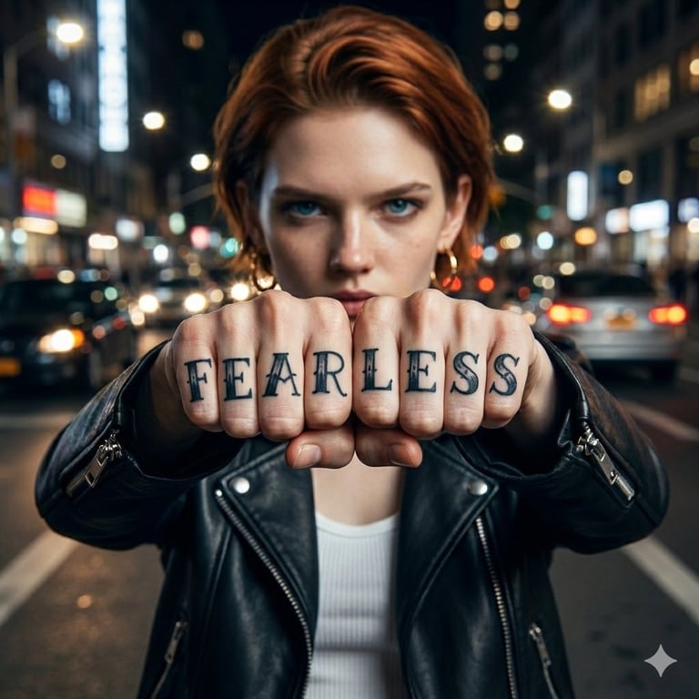 A prompt for generating a hyper-realistic, cinematic portrait of a woman with her fists extended towards the camera, featuring bold knuckle tattoos spelling 'Fear' and 'Less', set outdoors on a city street at night.