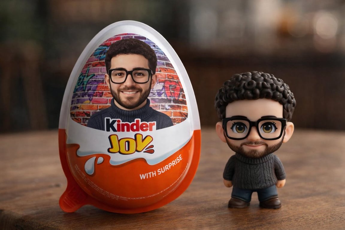 A highly structured JSON prompt for Nano Banana Pro, designed to generate hyper-realistic product photography of a Kinder Joy egg and a custom chibi collectible figurine, specifying composition, packaging design details based on a reference image, lighting, and material realism.