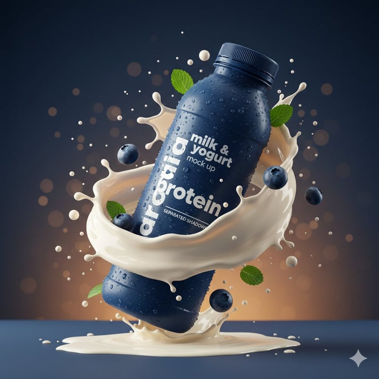A complex, structured prompt designed for hyper-realistic commercial product photography, focusing on two modules: a protein drink bottle and a coffee can, both featuring extreme clarity, cinematic lighting, and frozen liquid splash effects. This prompt is highly detailed, specifying resolution, aspect ratio, surface textures, floating elements, and background bokeh.