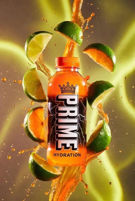 A prompt for generating a hyper-realistic product photograph featuring a Prime Hydration bottle rising dynamically from the center of an explosion of bright neon oranges and lime slices. It specifies glossy bottle texture, condensation beads, studio rim lighting, and a dynamic athletic composition against an electric yellow-green gradient background, suitable for modern sports branding.