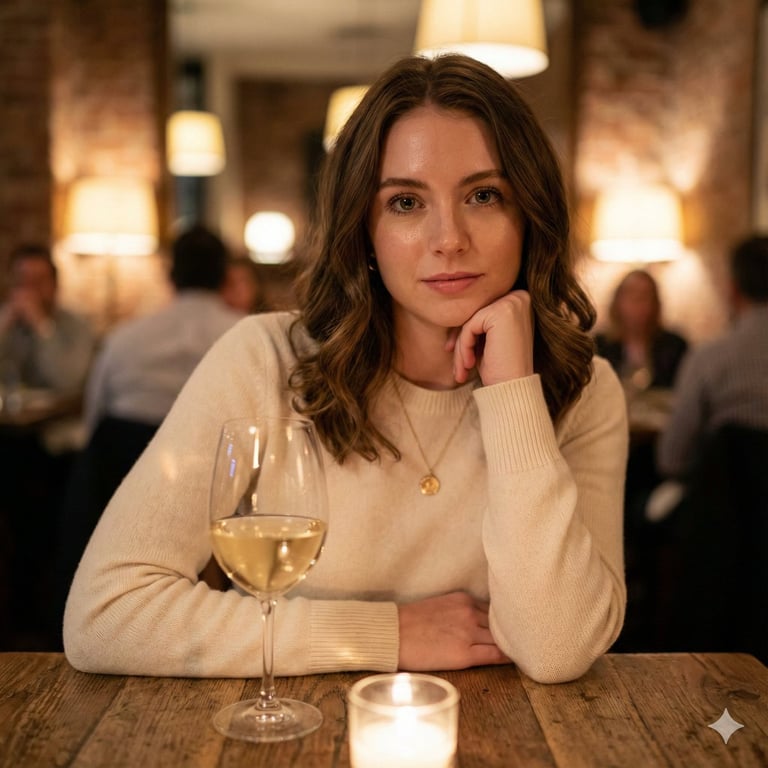 A detailed, hyper-realistic image generation prompt used to compare Nano Banana Pro and GPT Image 1.5. It describes a medium portrait of a young woman in an upscale, dimly lit restaurant, emphasizing cinematic warm lighting (Rembrandt lighting), natural skin texture, and specific camera settings (Sony A7R IV, 85mm f/1.2 GM lens) for a raw photography style.