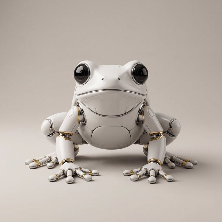 A prompt for generating a hyper-realistic, futuristic robotic frog with realistic proportions. The design emphasizes smooth white ceramic armor, large glossy black camera-lens eyes, and a clean, minimal composition with soft diffused lighting and a warm light gray background.