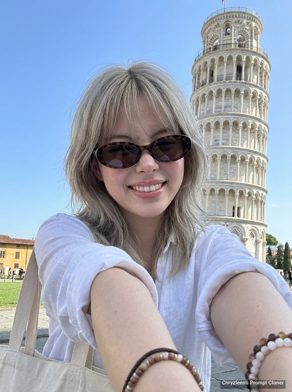 A highly detailed prompt for Gemini Nano Banana to generate a hyper-realistic, ultra-sharp smartphone photograph (iPhone 15 Pro style) of a young woman taking a wide-angle selfie at the Piazza del Duomo in Pisa. It emphasizes foreshortening, natural skin texture, specific clothing (white linen shirt), and deep focus on the background (Leaning Tower of Pisa).