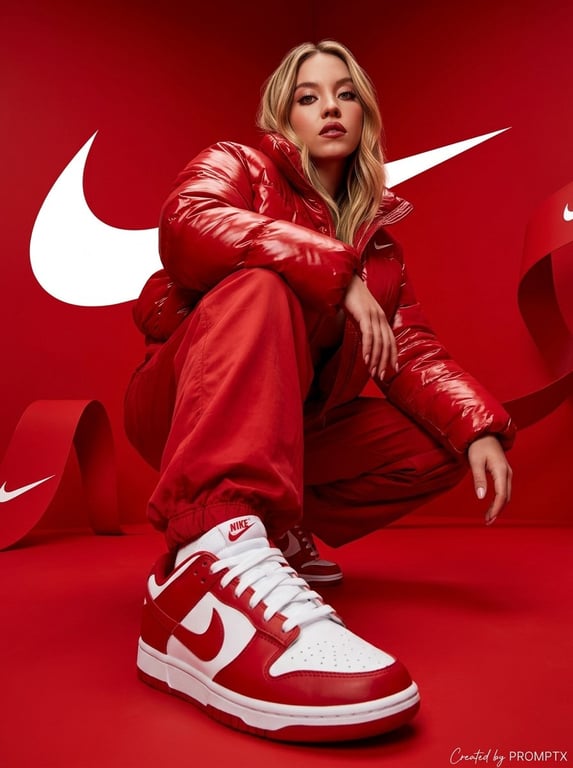 A detailed prompt for Nano Banana Pro to generate a hyper-realistic, ultra wide-angle shot of a man in a glossy, oversized red puffer jacket and matching pants, crouching in a monochromatic red environment with white Nike swoosh logos, focusing on sharp details and dramatic studio lighting.