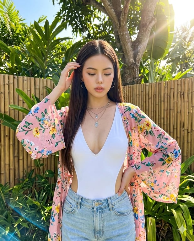 A detailed prompt for Gemini Nano Banana Pro to create a hyper-realistic, ultra-sharp photograph of a woman in a tropical setting, mimicking the aesthetic of a modern smartphone (iPhone 15 Pro). It emphasizes preserving the character's appearance from a reference image, specific clothing details, and bright, even HDR lighting with no deep shadows.