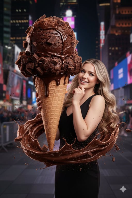 A detailed prompt for generating a hyperrealistic, high-fashion commercial image of a giant dark chocolate ice cream cone falling, set against the neon lights of Times Square, featuring a confident woman in a black evening dress.