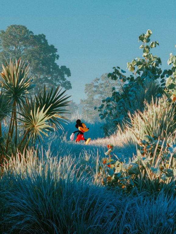 A simple image editing prompt used to add a specific element (a playhouse) behind a character (Mickey) in an existing image, demonstrating the model's ability to integrate new elements into a defined style.