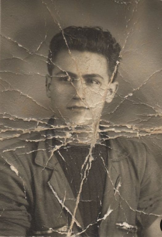 A prompt for restoring and enhancing an old, damaged photograph, requiring the preservation of the subject's exact facial identity and expression while fixing artifacts, restoring color, sharpening, and achieving a full HDR look, simulating a Nikon DSLR output.
