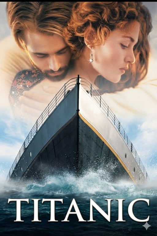 A highly specific, multi-constraint prompt designed for image-to-image generation, transforming an uploaded photo of a couple into a vertical, cinematic Titanic movie poster. It mandates preserving the original faces, poses, and composition while applying detailed cinematic lighting, color grading, typography, and texture effects.