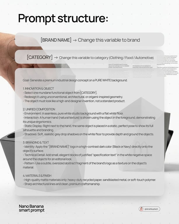 A complex, multi-step prompt template for generating a premium industrial design concept on a pure white background, focusing on architectural geometry, material finish, branding integration, and a human interaction element.