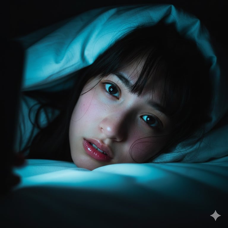 A highly specific, structured Nano Banana Pro prompt for generating an intimate, hyper-realistic portrait of a Japanese high school girl. The prompt focuses on the dramatic lighting effect of a smartphone screen (Cyber-Cyan glow) in a pitch-black room, emphasizing details like wet skin, dilated pupils, and the 'Igari' (hangover) makeup style to create a secretive and vulnerable atmosphere.