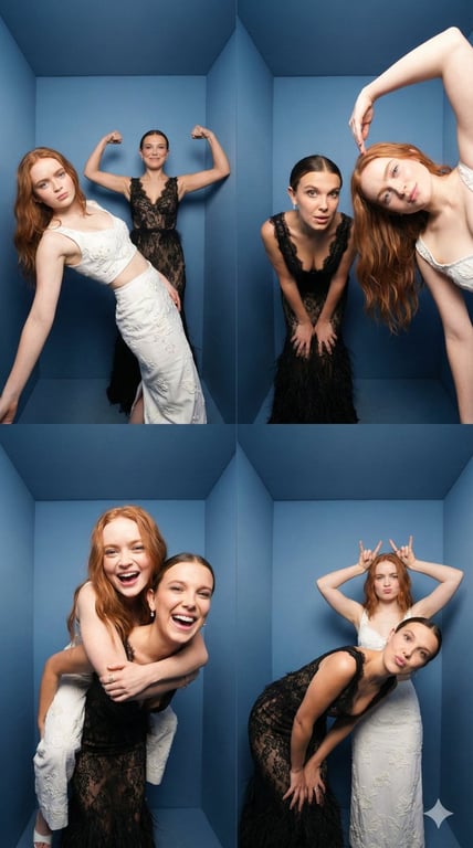 A highly specific, structured prompt designed to create an ultra-realistic 2x2 photobooth collage featuring two subjects (Sadie Sink and Millie Bobby Brown, requiring reference images for exact likeness). The prompt details four distinct, dynamic poses for each quadrant, emphasizing the aesthetic of an iPhone 17 Pro wide-angle photobooth snap with bright flash lighting and a seamless layout.