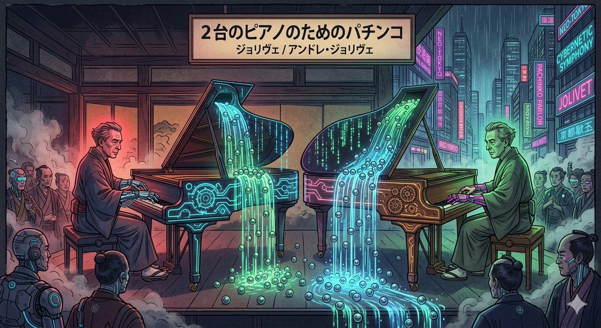 An image generation prompt for Nano Banana Pro (Gemini 3 Pro Image) to create a cyberpunk image related to the composer Jolivet and his piece 'Pachinko for Two Pianos,' featuring Jolivet and his doppelgänger as pianists.
