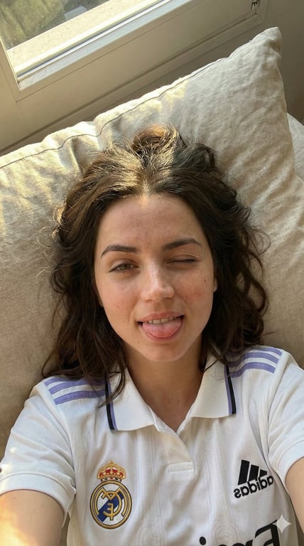 A highly detailed JSON prompt for Gemini Nano Banana Pro requesting a photorealistic, candid, high-angle selfie portrait of Scarlett Johansson in a Real Madrid 2022/2023 home kit, focusing on authentic skin texture and golden hour lighting in a bedroom setting.