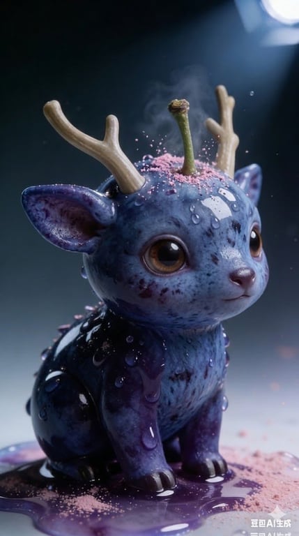 A highly detailed prompt for generating a macro photograph of a cute, Kawaii-style blueberry fawn forest spirit. It specifies realistic fruit textures, water droplets, pink powder, fine rising steam, and includes two tiny mini deer companions. The scene uses dramatic back-lighting and a shallow depth of field.