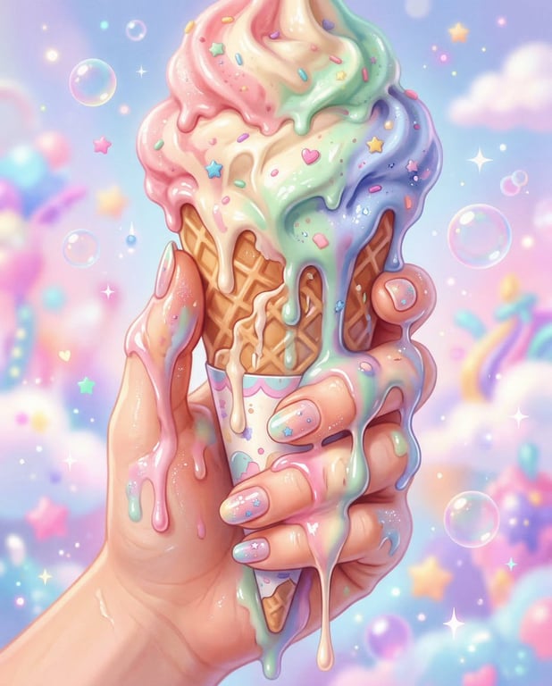 A prompt for Nano Banana 2 to generate a kawaii pop surreal illustration featuring a super close-up view of a hand holding a melting ice cream cone, focusing on glossy details and soft pastel colors.