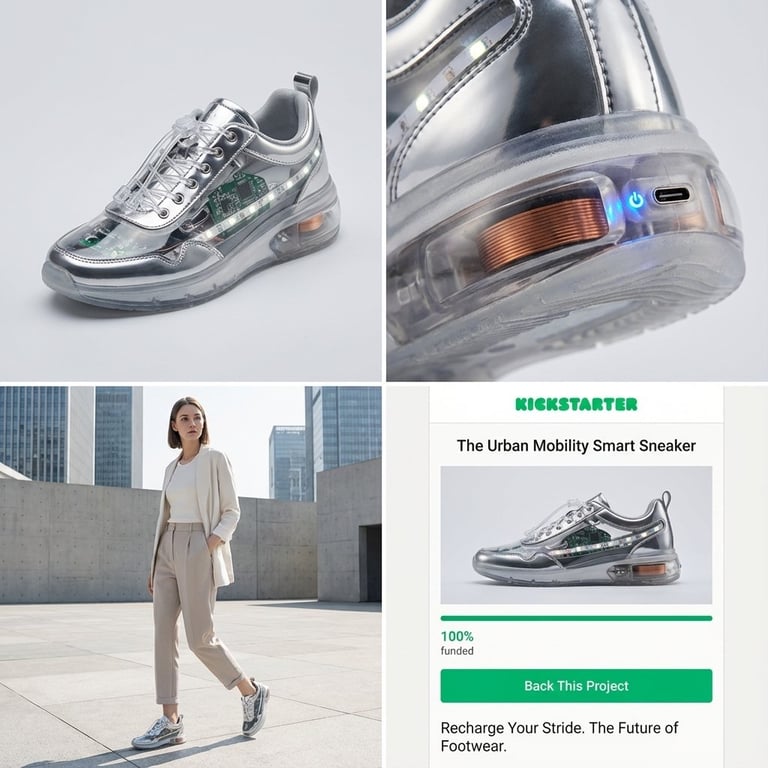 A detailed system prompt instructing the model to act as a Senior Product Designer and Crowdfunding Campaign Manager. It analyzes an input image's material properties to automatically select and generate a concept for a modern smart wearable (Jacket, Backpack, or Sneaker) and then visualizes the concept in a precise 2x2 grid layout suitable for a Kickstarter campaign page, including a hero shot, detail shot, lifestyle shot, and campaign UI mockup.