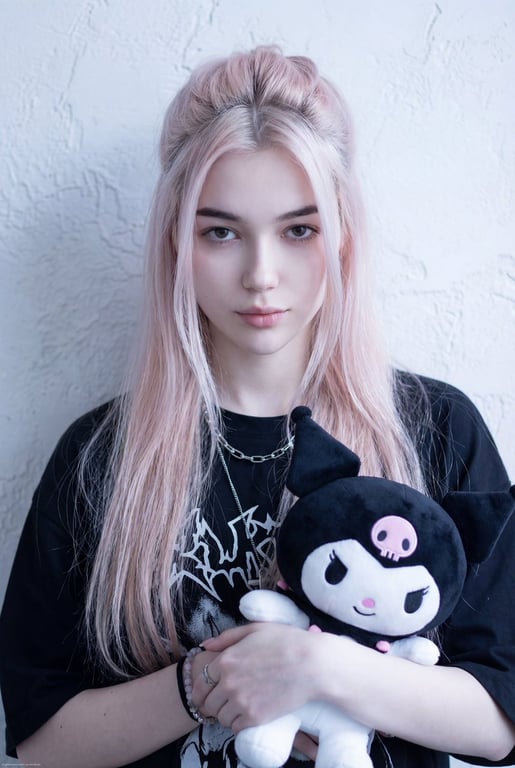 A highly detailed JSON prompt for Nano Banana Pro to generate a cool-girl influencer portrait. It specifies a young woman holding a Kuromi plush toy, with a confident, stylish aesthetic. The prompt includes meticulous details on appearance (cool pale skin, low-saturation pale pink hair), outfit (Korean-style cool and spicy fashion), lighting (cool-toned, slightly overexposed), and camera settings (Canon EF 85mm f/1.2 lens, macro-level detail).