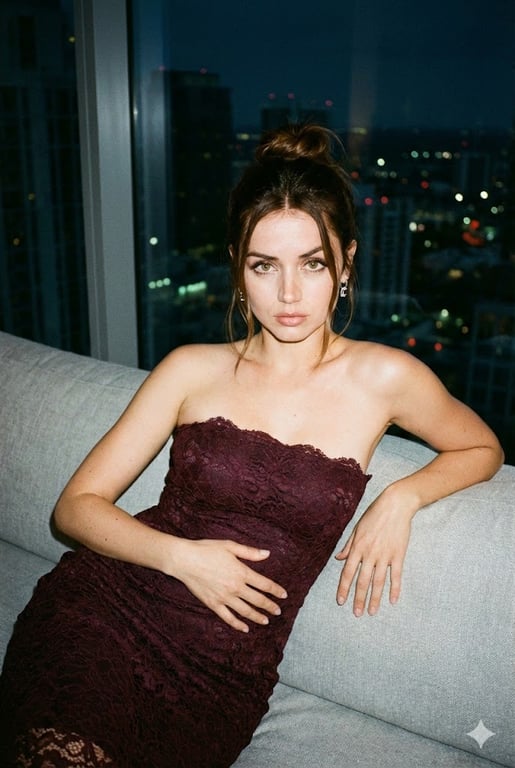 A structured JSON prompt for generating a close-up portrait in the style of late 1990s/Y2K editorial flash photography, featuring a subject resembling Billie Eilish in a dark burgundy corset dress against a city skyline background.