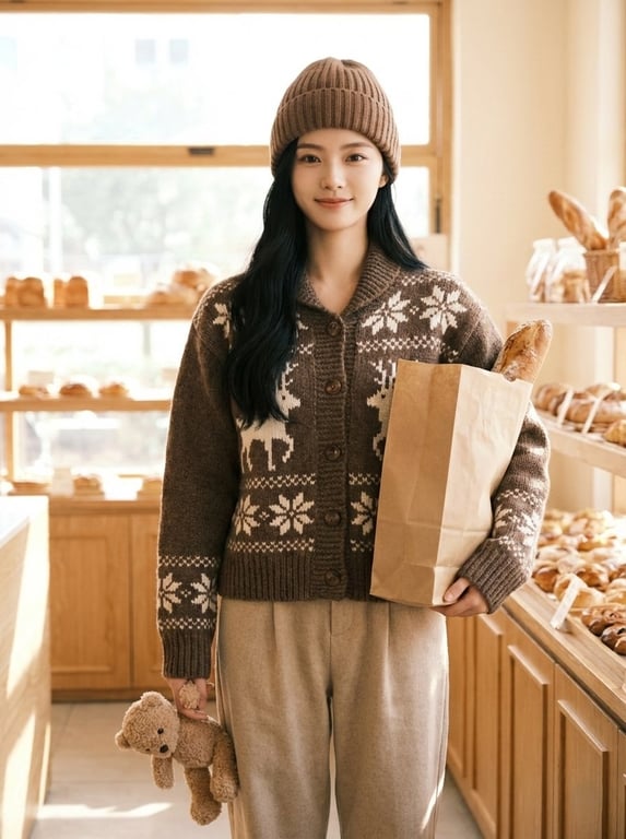 A photorealistic prompt designed to create a cozy, 'Life-log Style' image with a warm color palette and low contrast, featuring a young woman in a bakery setting with specific clothing and props (baguettes, teddy bear), aiming for an unposed, healing atmosphere.