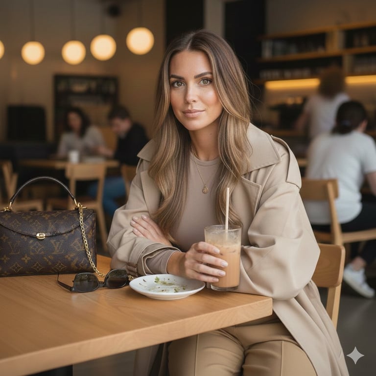 A detailed prompt for generating a lifestyle photograph of a young woman seated in a modern café, focusing on a relaxed pose, beige activewear, natural freckles, and warm ambient lighting to achieve an 'everyday luxury' aesthetic.