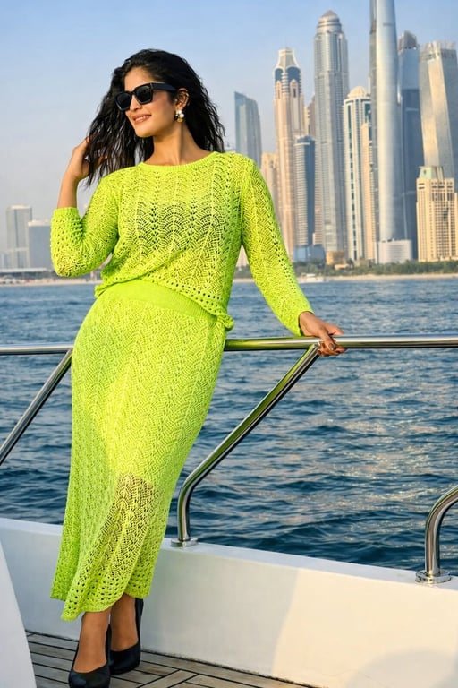 A structured prompt for generating an outdoor lifestyle portrait of a woman standing on a yacht, wearing a neon lime green crochet knit set, against a modern city skyline. The prompt details the pose, clothing texture, and natural sunlight effects.