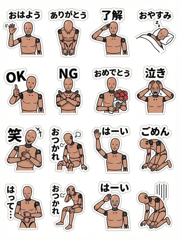 A Japanese prompt asking for a 4x3 grid of 12 LINE stickers featuring a standing doll character, each with a simple one-word phrase, ideal for messaging stickers.