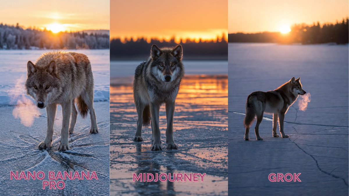 A detailed image generation prompt for a dramatic nature scene featuring a lone grey wolf on a frozen lake at dawn. It specifies lighting (warm orange glow, cold shadows, backlighting), camera settings (85mm, low angle, shallow depth of field), and texture details (visible breath, ice cracks, individual guard hairs).