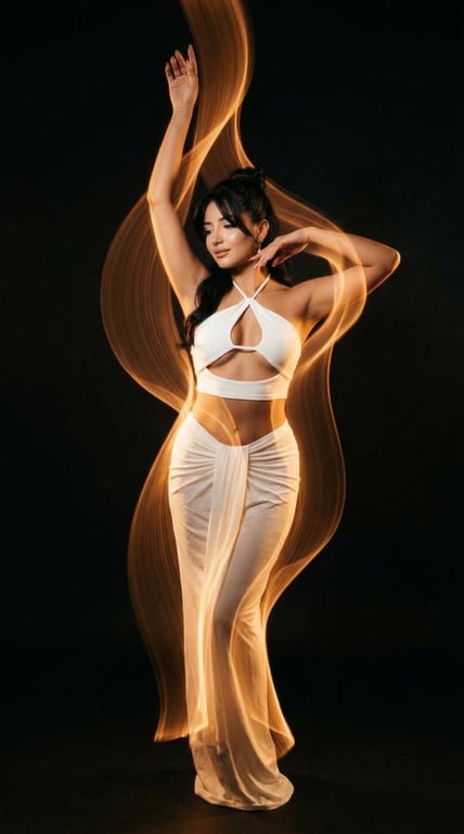 A highly structured JSON prompt for Nano Banana 2 designed for image-to-image generation, transforming a reference image into a photorealistic editorial fashion portrait using long-exposure light painting effects in amber and golden-orange tones.