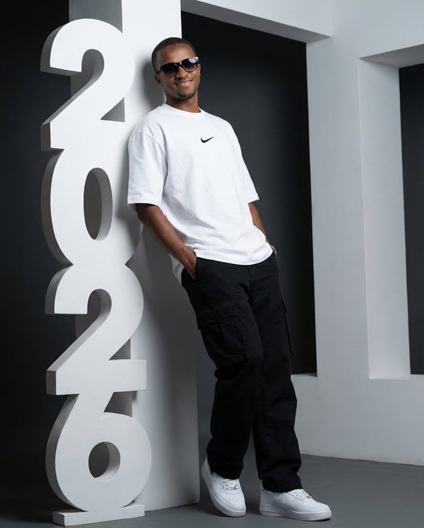 A prompt for generating an ultra-realistic, low-angle portrait of a person in streetwear (oversized Nike t-shirt, cargo pants, Air Force sneakers) leaning against a large, vertical, white sculptural installation of the text '2026'. The prompt emphasizes preserving the subject's face, cinematic depth (85mm lens), and a confident, editorial mood blending fashion and architectural design.