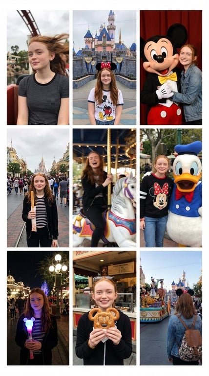 A highly specific JSON prompt designed to generate a 3x3 Instagram-style grid of intentionally low-quality, candid smartphone photos featuring a young Asian woman enjoying various moments at Disneyland. The prompt focuses on maintaining consistent identity across all nine frames while simulating realistic smartphone limitations like motion blur, uneven exposure, and digital grain.