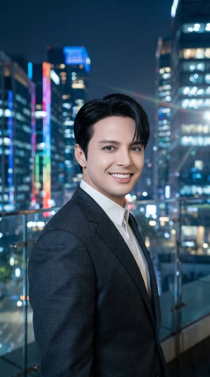 A Nano Banana 2 prompt for generating a photorealistic, cinematic portrait of Luis Miguel reimagined as a Korean pop star, standing in Seoul's Gangnam district at night, specifying East Asian features, tailored dark suit, and subtle lens flare effects.