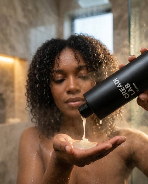 A prompt for generating a cinematic, over-the-shoulder composition of a Black woman massaging shampoo into her hair in a glass shower, focusing on rim lighting, hair texture definition, and luxury beauty advertisement style.