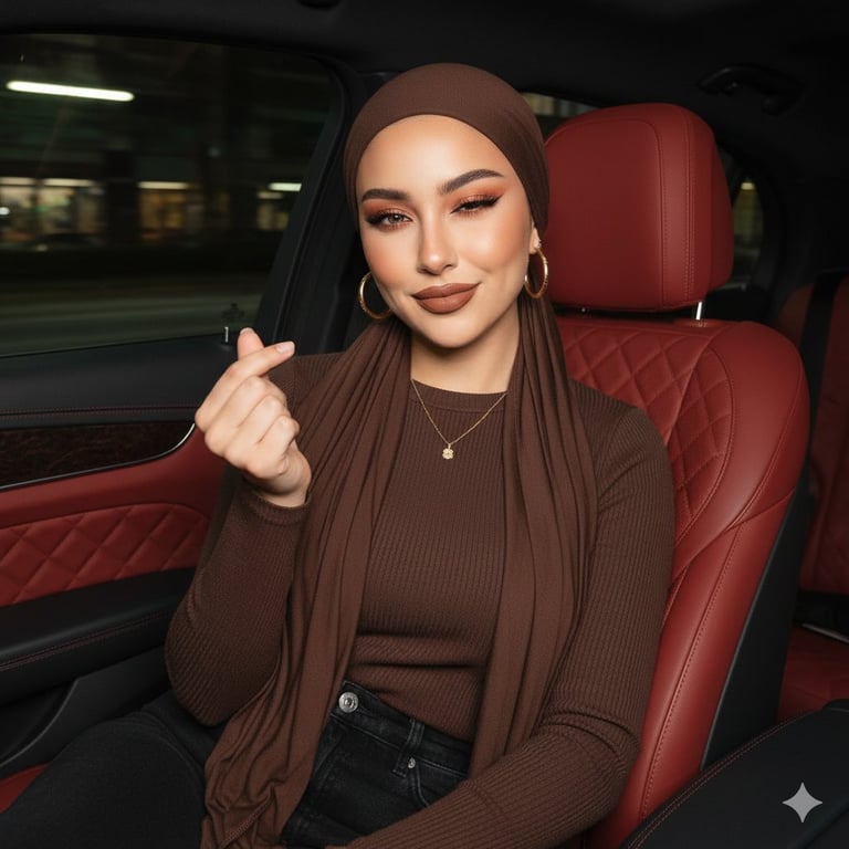 A structured prompt for Gemini Nano Banana Pro requesting a high-resolution portrait of a beautiful young woman with olive skin, wearing a chocolate brown jersey hijab, winking and making a 'finger heart' gesture inside a luxury vehicle at night, emphasizing cinematic lighting and social media aesthetic.
