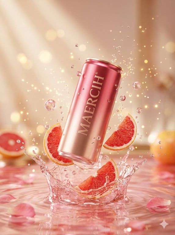 A prompt for generating a high-realism, luxury commercial advertisement image. It features a metallic rose-pink beverage can suspended mid-air, surrounded by frozen liquid splashes, grapefruit slices, and golden bokeh particles, set against a soft pastel peach and blush background, emphasizing studio quality lighting and ultra-clean reflections.