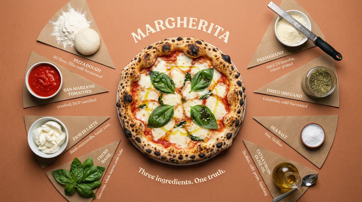 A customizable prompt template for generating a top-down flat lay image of food ingredients arranged in a radial burst pattern, designed to look like a luxury cookbook editorial or heritage restaurant poster, with technical annotations and a central plated dish.